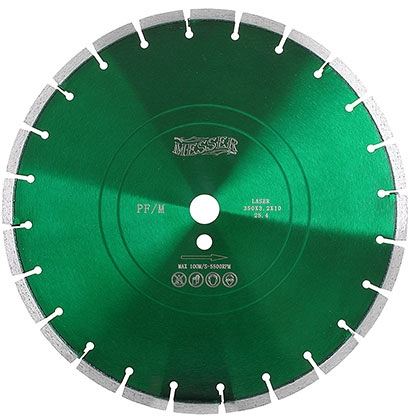 Диск отрезной алмазный по бетону Messer PF/M (Мессер ПФ/М) с лазерной наваркой сегментов предназначен для резки свежего бетона в день укладки (от 2-х часов до суток) только с подачей воды для охлаждения при нарезке деформационных швов при изготовлении бетонных полов (склады, парковки и прочие площадки с бетонным покрытием), ориентирован на компании, занимающиеся производством промышленных полов.