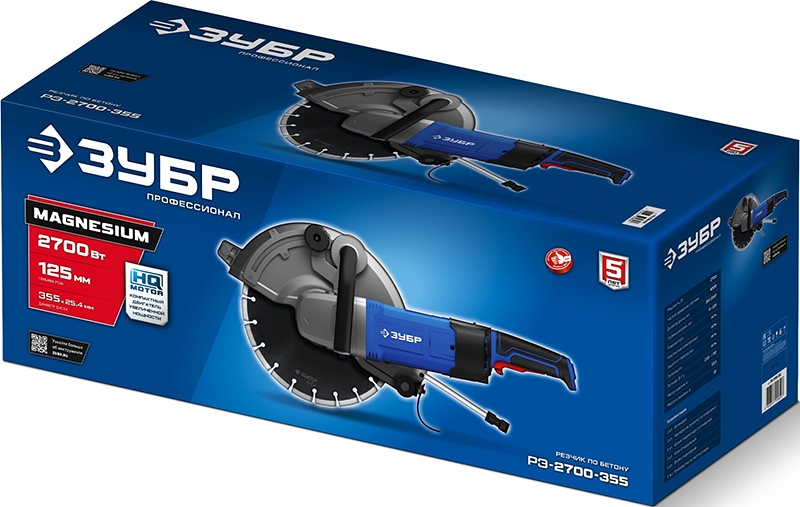 Электрический резчик по бетону Зубр Профессионал РЭ-2700-355 (Zubr Professional RE-2700-355) предназначен для наиболее трудных и глубоких (до 125 мм) резов любых материалов – бетона, асфальта, бордюров, металла, кирпича. Высокая мощность двигателя в сочетании с передаточным отношением редуктора дает большой крутящий момент на валу, что позволяет резать быстро и эффективно. Эффективный пылеотвод или работа с подачей воды защищают компоненты от пыли.