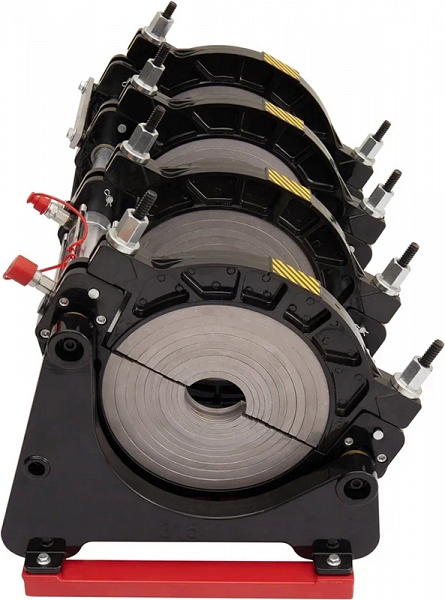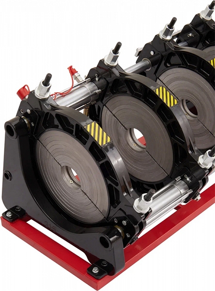 - Центраторо с гидравлическим приводом и 4-мя прочными широкими зажимами, один из которых легко может быть удален для облегчения сварки полимерных фитингов с трубами (тройники, крестовины, отводы), имеет большой запас прочности за счет качественного сплава и ребер жесткости, что позволяет сваривать полимерные трубы с любым показателем SDR