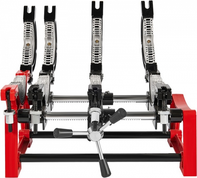 - Центратор с 4-мя откидными зажимами и фиксатором имеет большой запас прочности за счет качественного сплава и ребер жесткости, что позволяет сваривать полимерные трубы с любым показателем SDR