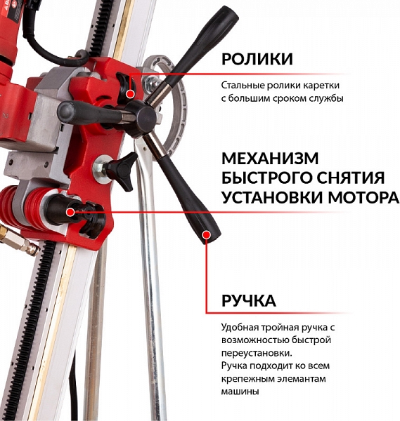 - Механическая защита двигателя: механическая фрикционная муфта при резком повышении нагрузки или заклинивании алмазной коронки защищает редуктор и электродвигатель от поломки