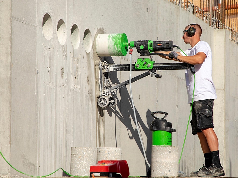 Установка алмазного бурения Eibenstock DBE 352 (Айбеншток ДБЕ 352) предназначена для мокрого сверления отверстий Ø 41 – 352 мм в железобетоне, кирпиче, натуральном камне и асфальте в гражданском и промышленном строительстве, при проведении электромонтажных работ, монтаже систем водоснабжения, отопления, вентиляции и других инженерных сантехнических коммуникаций.