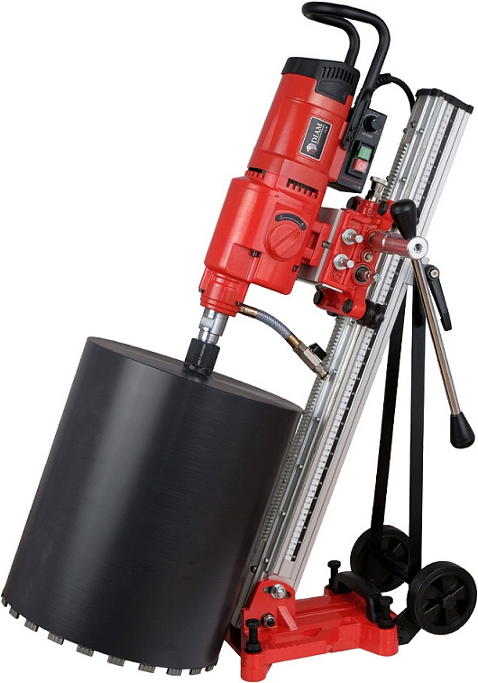 Установка для алмазного бурения Diam ML-350/2AEDC (Диам МЛ-350/2АЕДЦ) – мощная двухскоростная сверлильная машина с наклонной стойкой для сверления отверстий в бетоне и железобетоне Ø 20 – 300 мм, кирпичной кладке и других строительных материалах Ø 20 – 350 мм, под углом до 45°, с подачей воды.